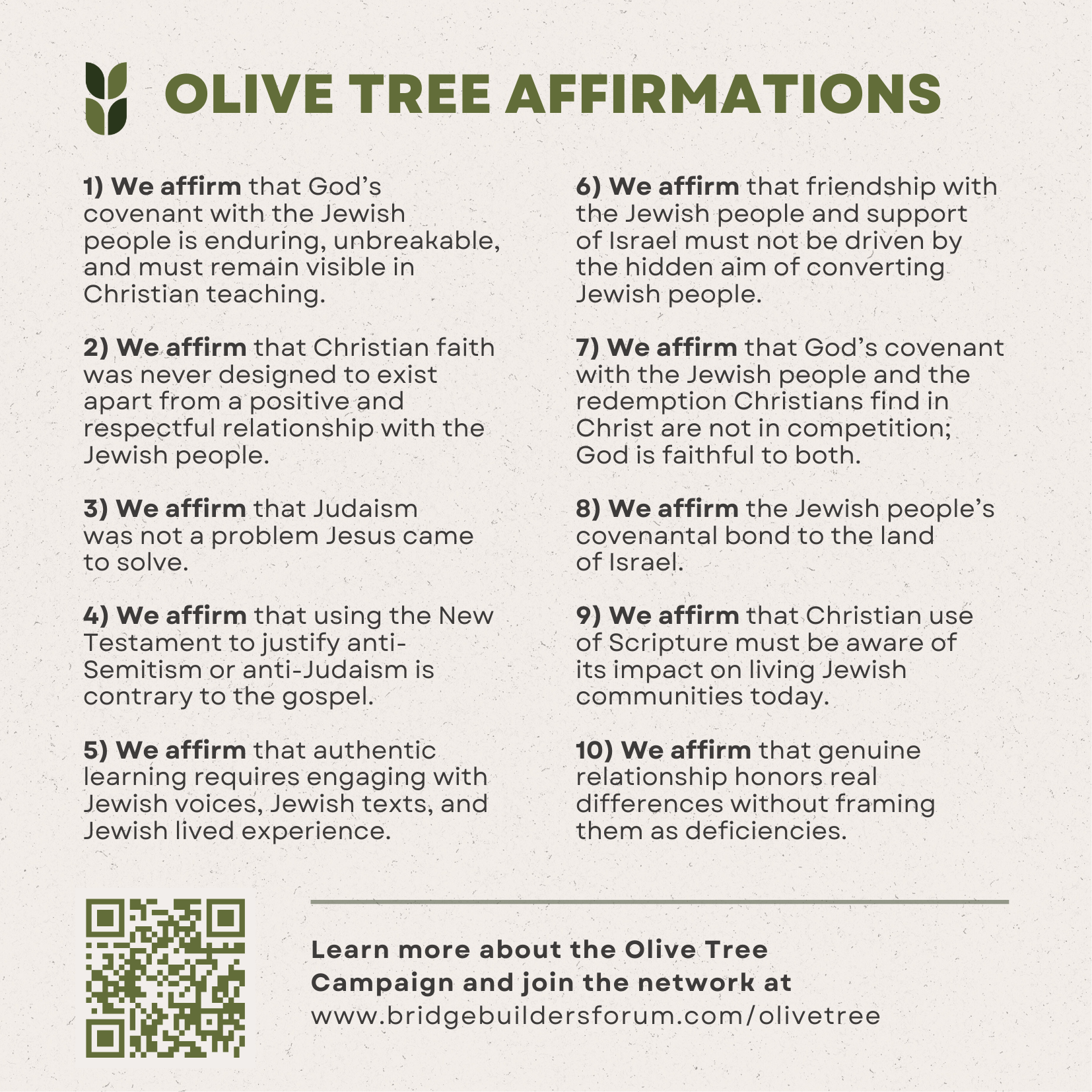 Jewish–Christian relations have strengthened over the last century through landmark scholarly, ecclesial, and interreligious statements, such as Nostra Aetate. Yet despite this important progress, much of this work has not reached ordinary congregations, pastors, and lay believers. The Olive Tree Affirmations seek to stand on these shoulders and bring this essential work into the day-to-day life of regular people in pulpits and pews. These affirmations provide clear language for resisting anti-Semitism and explain why honoring the Jewish people belongs at the heart of Christian faithfulness.